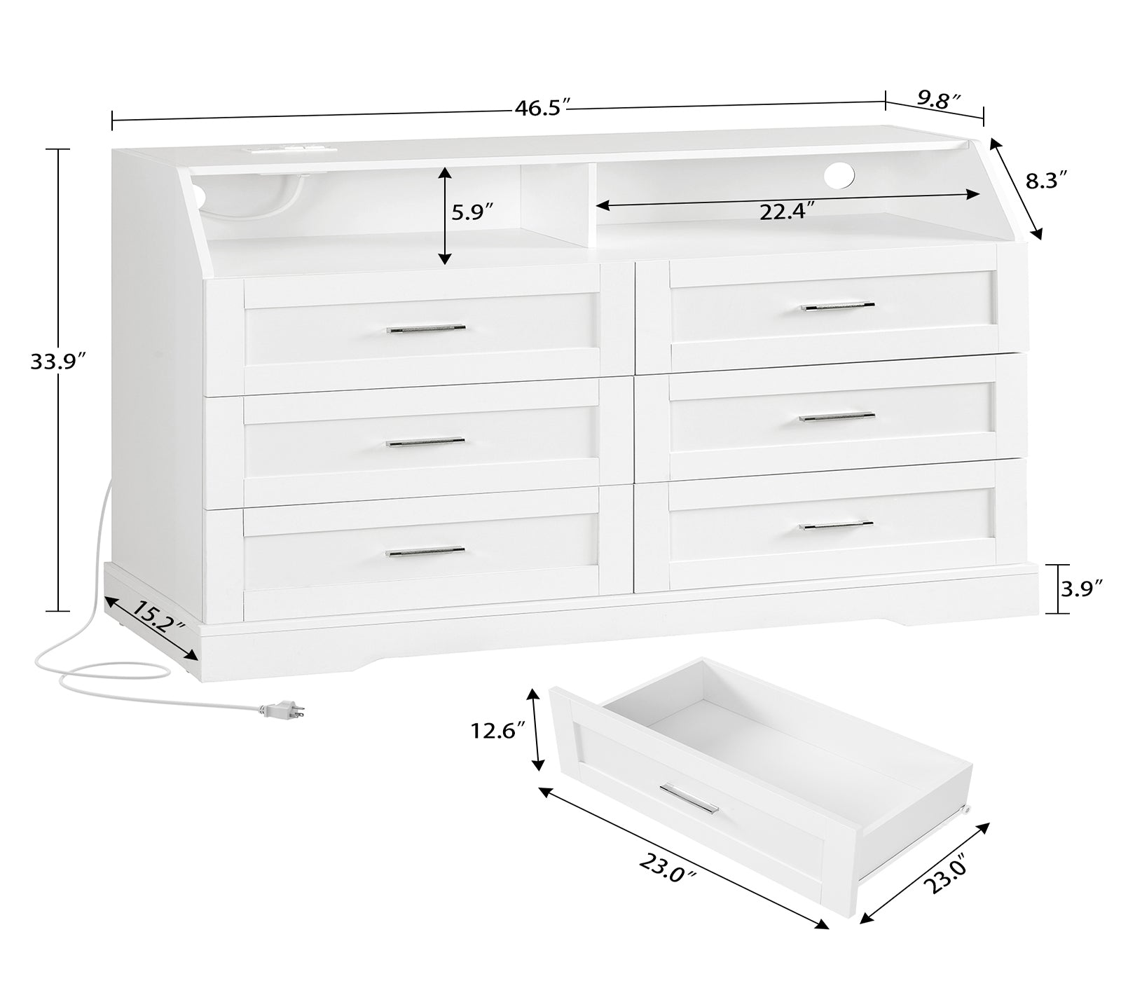 46.5'' Wide White Dresser for Bedroom, 6 Drawer Dresser with Charging Station & LED Lights, Closet Organizer for Bedroom, White