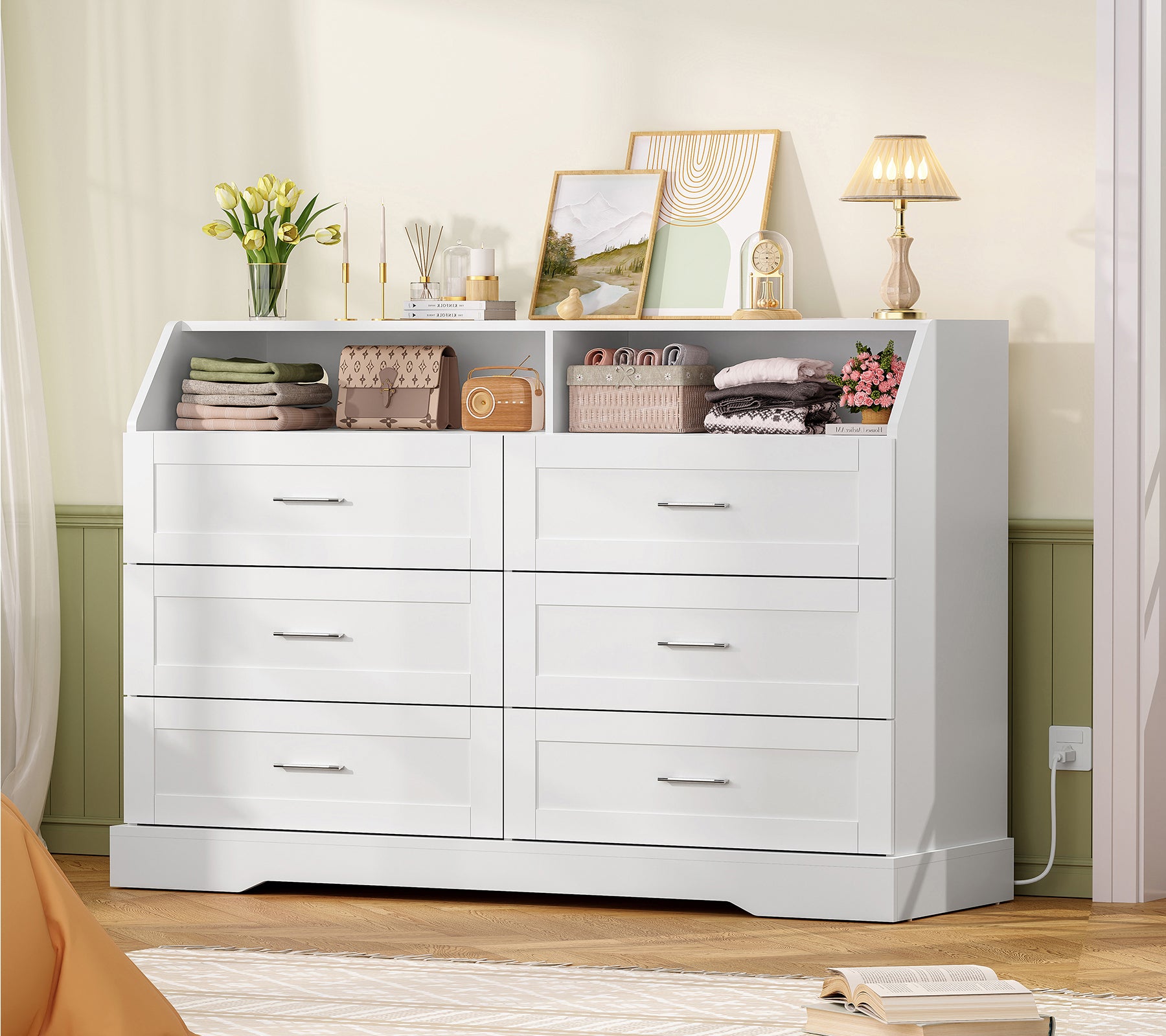 - ⭐【Categorized Storage Space】Measuring 15.2''D*46.5'W*33.9''H, deeper than ordinary dresser, semi-open countertop is designed for putting alarm clocks, photos, mirrors, etc. 6 drawers allow you to properly organize anything from cosmetics, clothes to nappies and toys. Everything neatly organized and within arm's reach.
