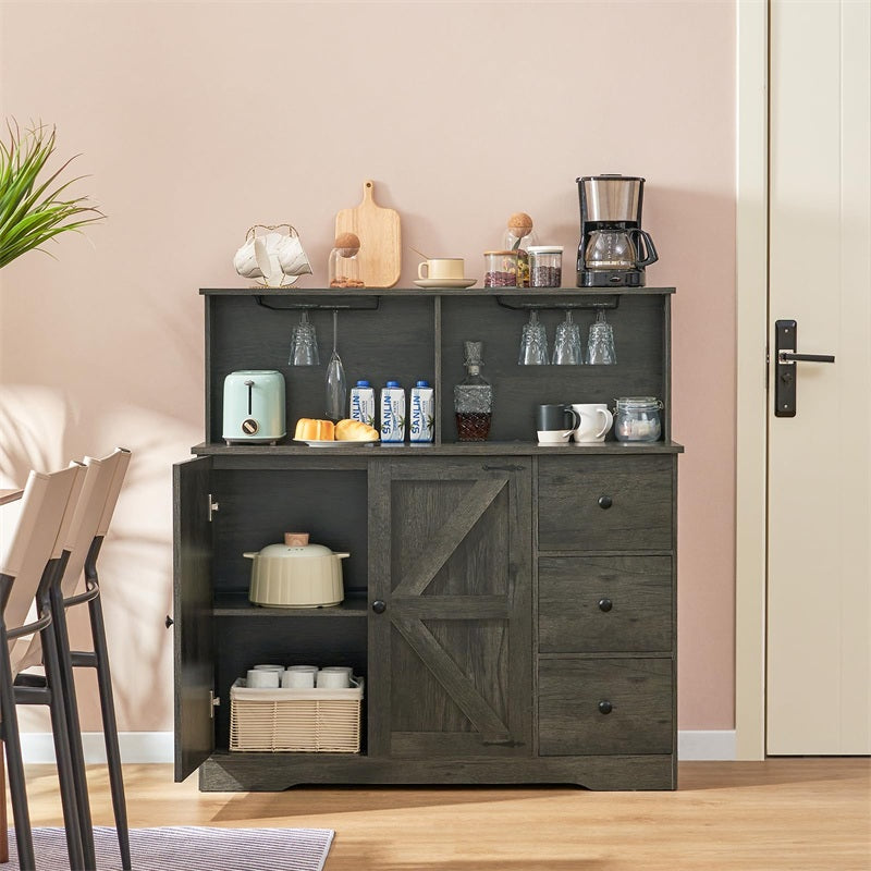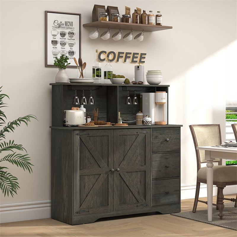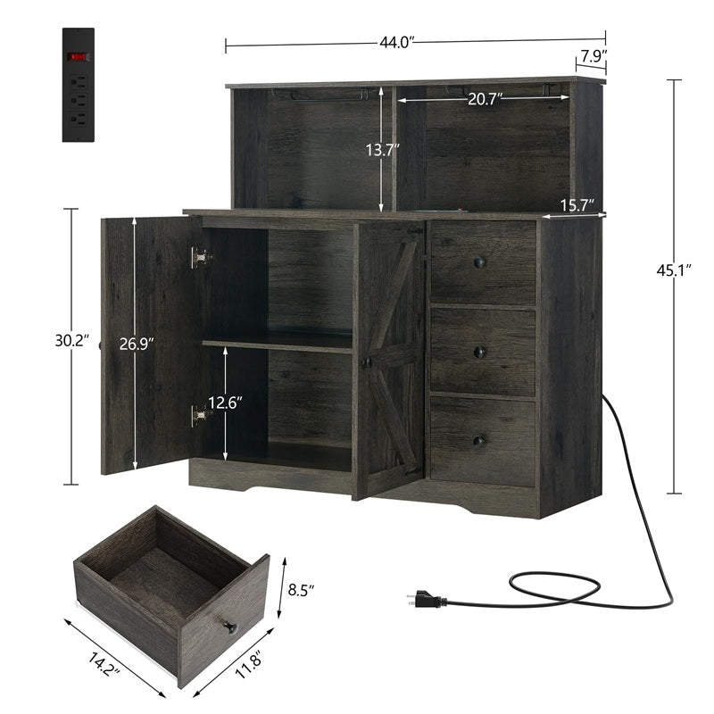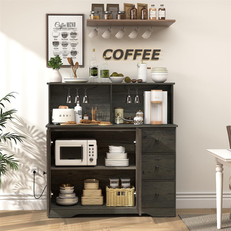Farmhouse Coffee Bar Cabinet with Power Outlet, Sideboard Buffet Table with Wine and Glass Rack & Adjustable Shelves, Home Liquor Bar for Dining Room, Dark Grey