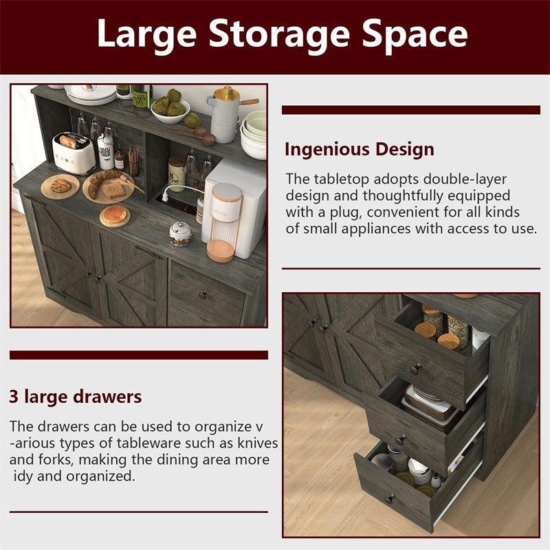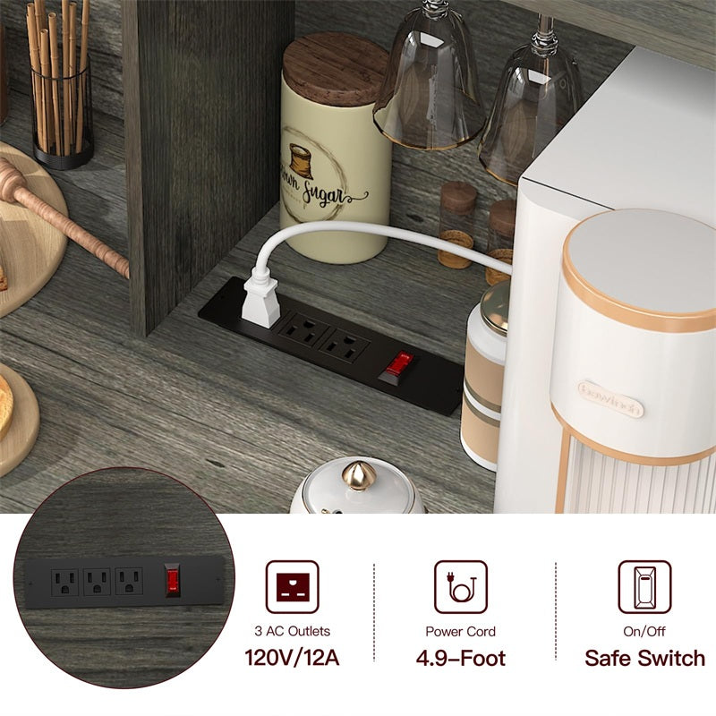 Double desktop design: The buffet cabinet adopts a double-layer structure, which not only effectively utilizes the space, but also enhances the storage function. The sideboard buffet is equipped with 2 unique cup holders, which can meet your needs of placing cups; and the storage cabinet is equipped with a plug with on/off control, which allows you to easily and conveniently use all kinds of small home appliances while enjoying food.