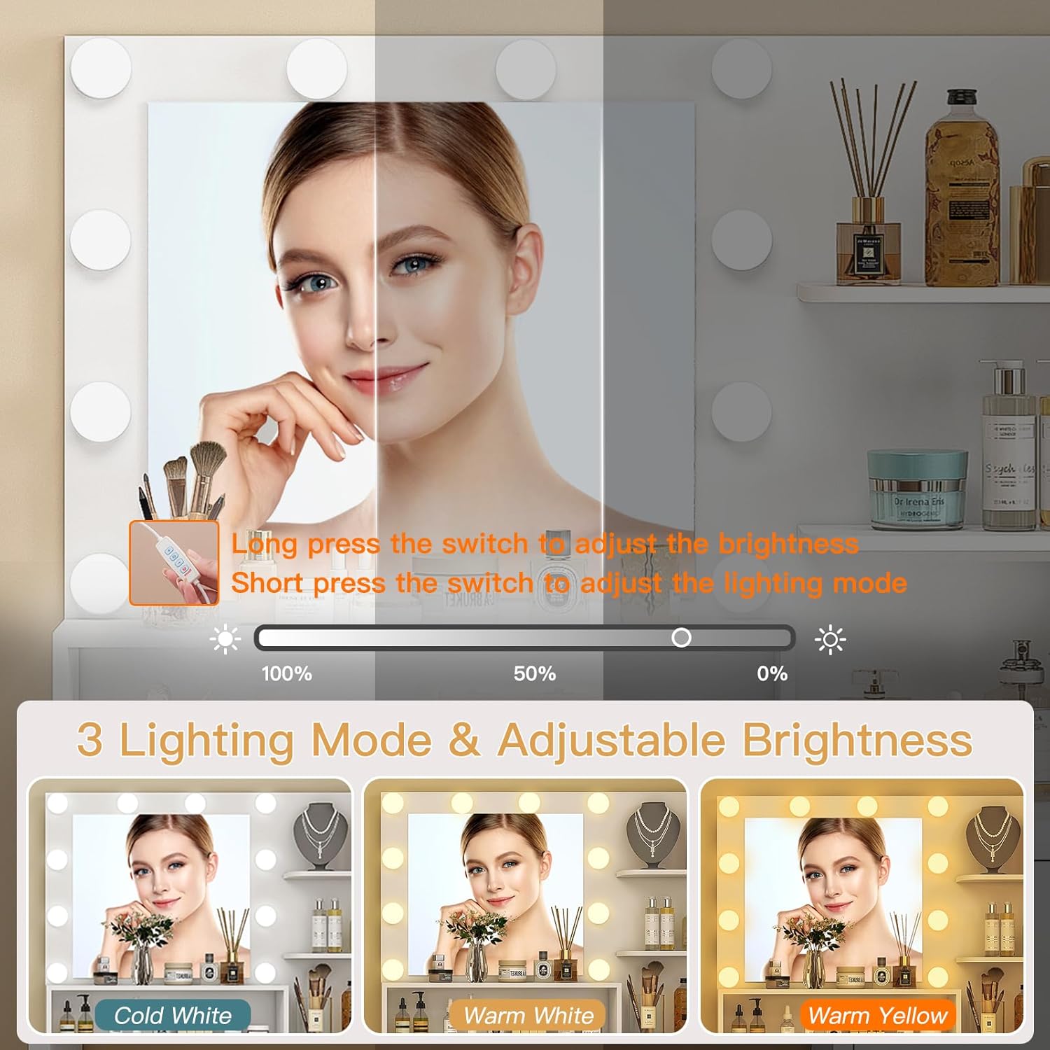 Tri-Color Lighting & HD Mirror: With 10 Hollywood bulbs, 3 lighting modes, achieve flawless makeup looks for any occasion and complete control over your makeup. Indulge in the star-like makeup experience now