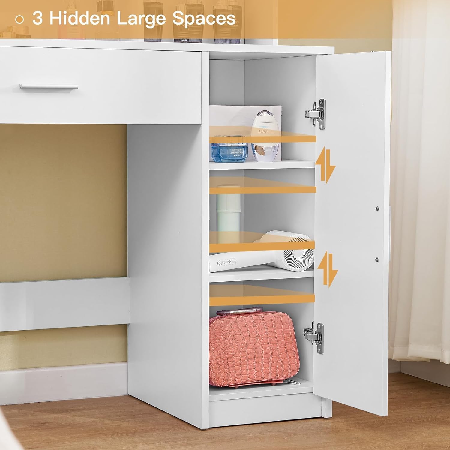 All Storage Vanity Desk: The 3-tiers open shelf and a tabletop layout make all your essentials easy access; The closed drawer and 3-tiers shelf cabinet keep everything clean and secure