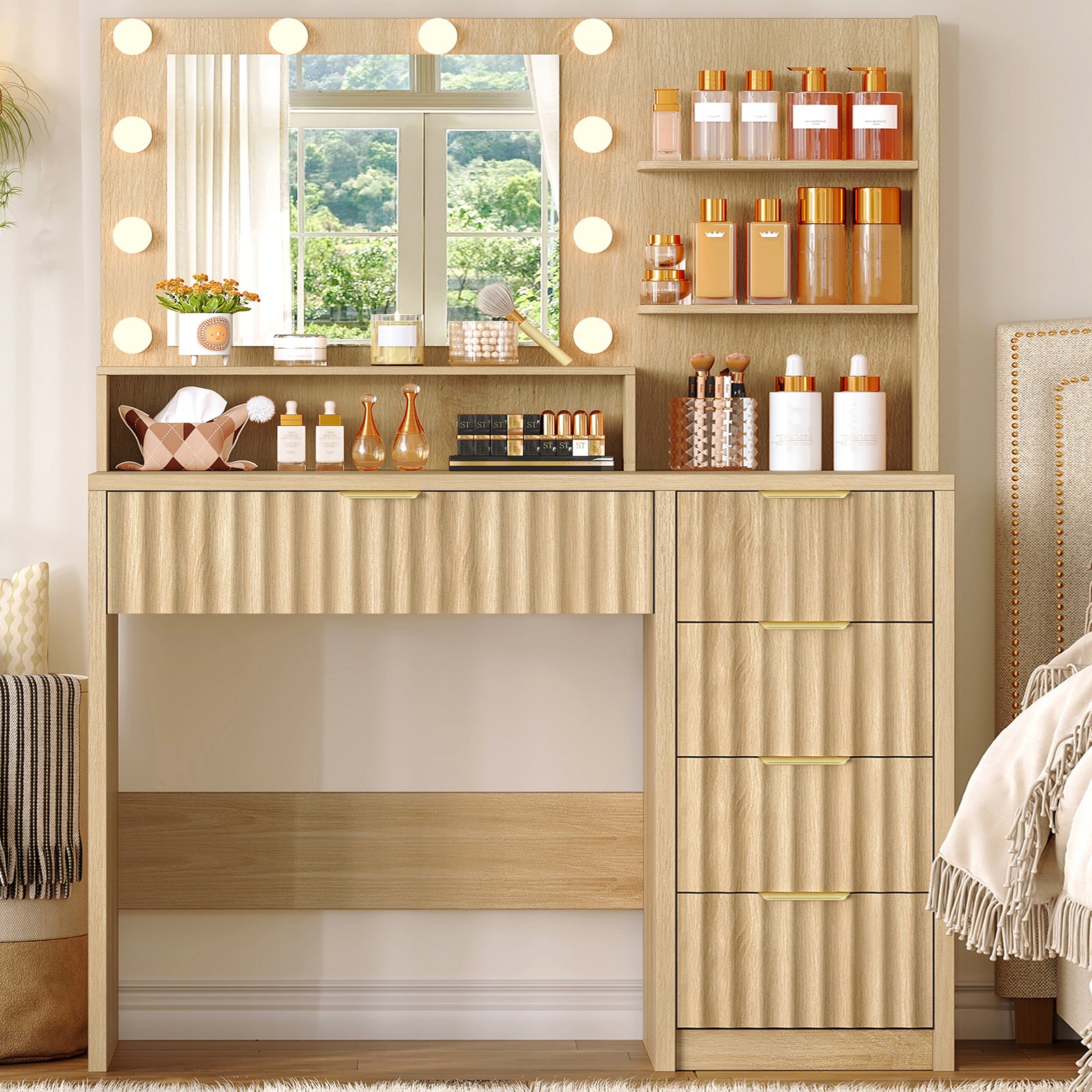 Luxury Wood Grain & Gold Hardware: Fluted paired with premium gold handles, this vanity boasts a minimalist yet high-end look. It seamlessly complements various decor styles, becoming a focal point in your bedroom while creating a cozy, glamorous makeup atmosphere.