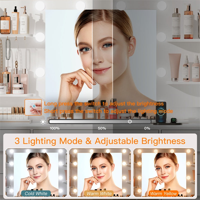 - Adjustable Lighting Modes: Vanity has three lighting modes. Natural, cold, or warm lighting is available, and customizable brightness options to achieve flawless looks for any occasion. Shine bright like a diamond with the perfect lighting that enhances your beauty