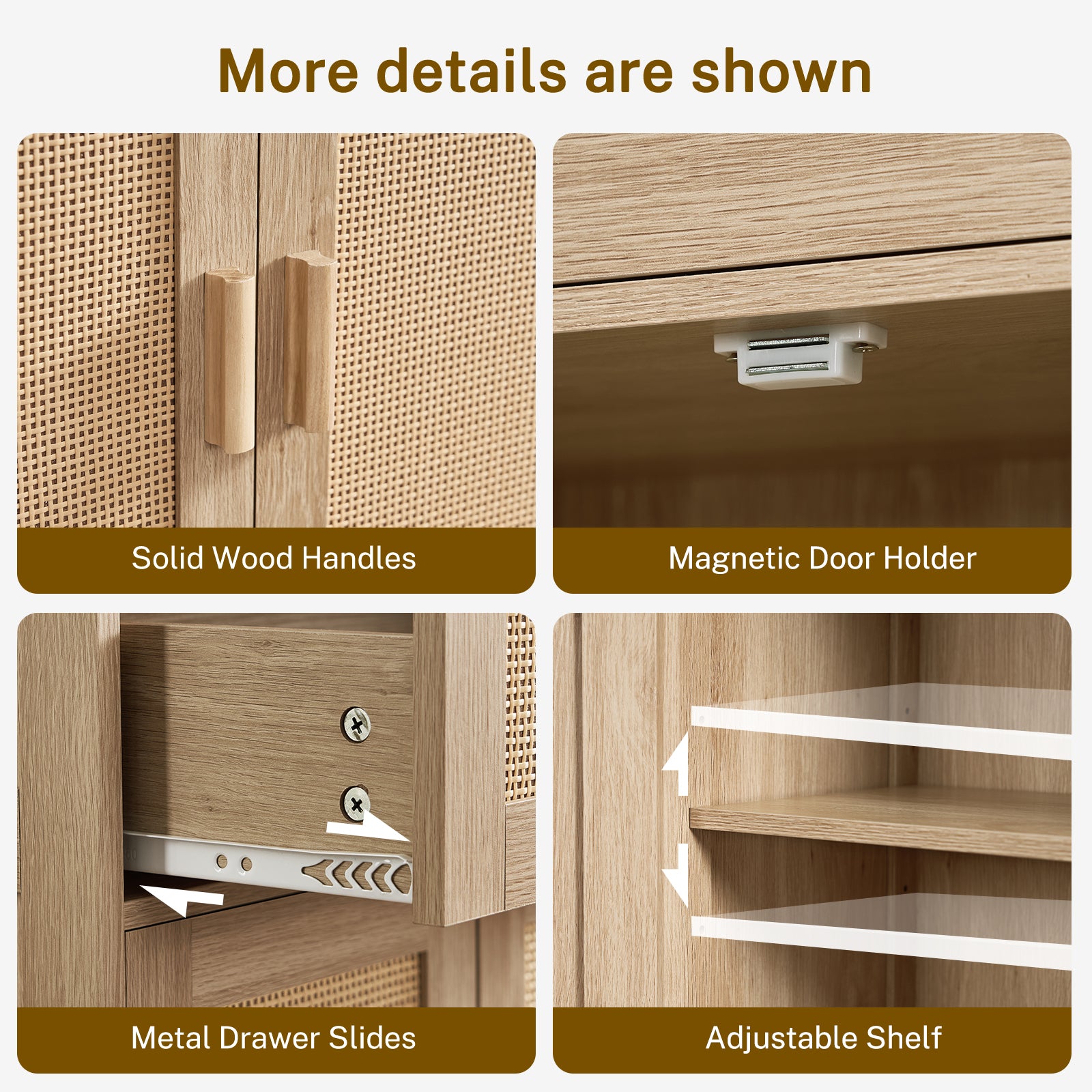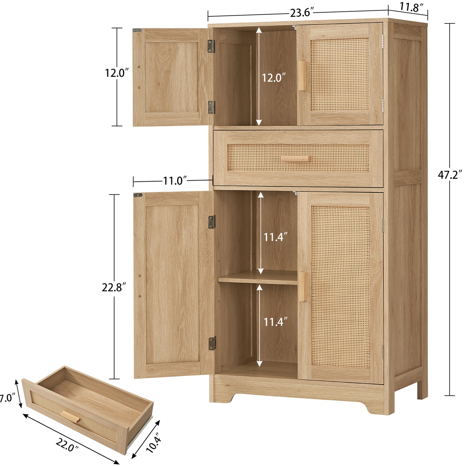 TEENFON 47.2" H Tall Storage Cabinet with Adjustable Shelf, Rattan Cabinet with Large Drawer, Cupboard for Living Room, Dining Room, Entryway, Home Office, Natural