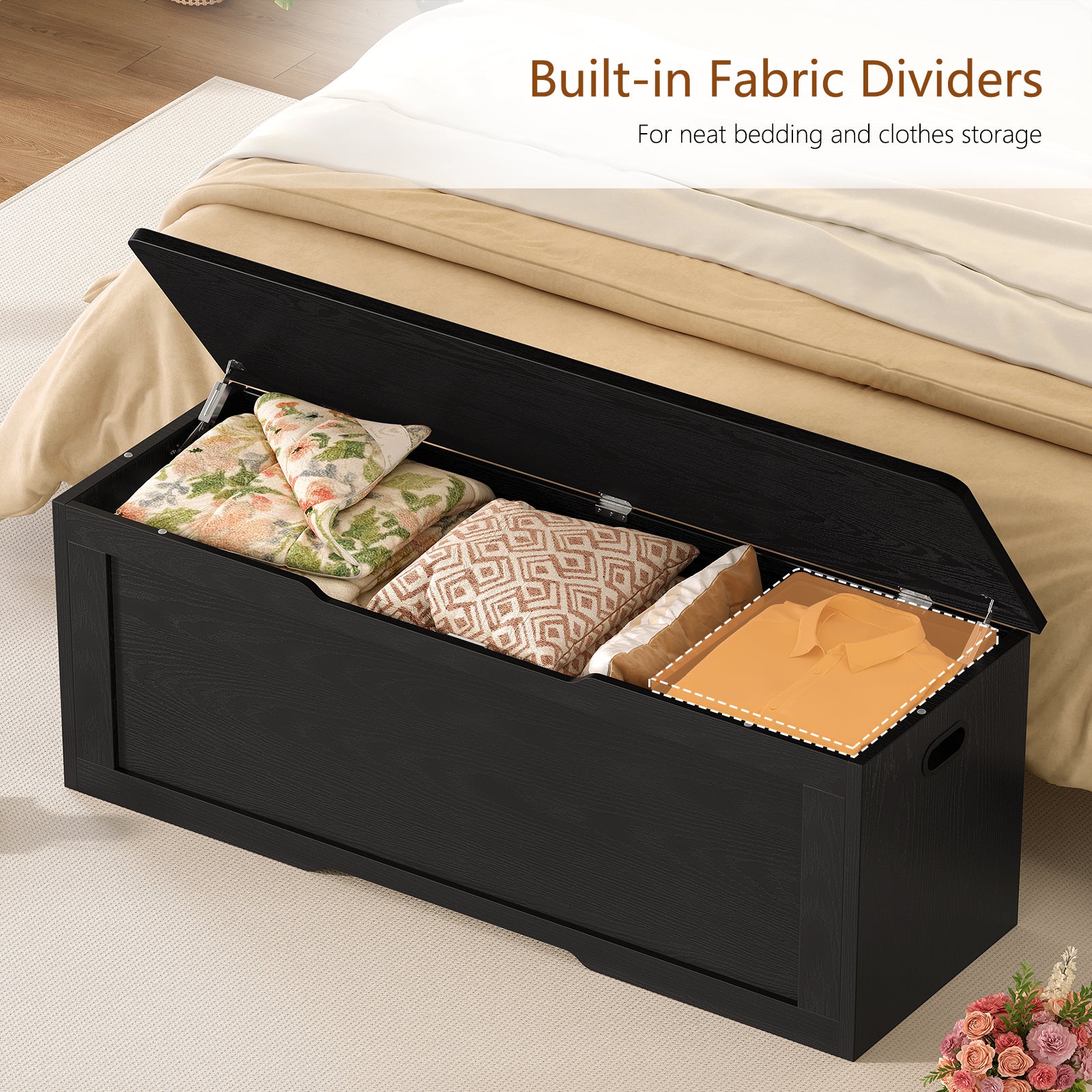 TEENFON 47.2" Large Storage Chest with Fabric Drawer, Toy Box with Safety Hinges, Extra Wide Storage Bench for Bedroom, Living Room, Entryway, Supports 300 lb, Black