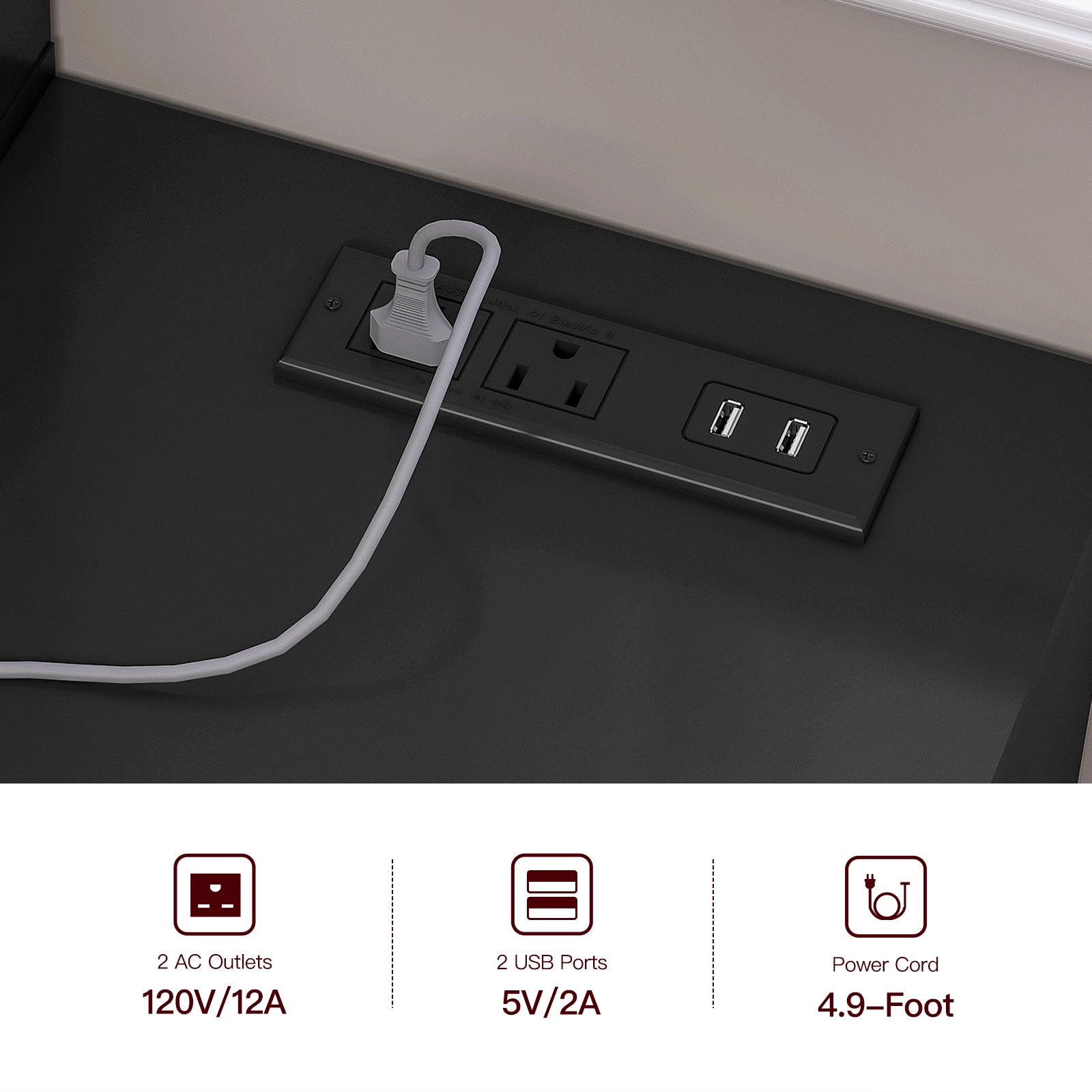 - Built-in Charging Station: Having the plugs in the front makes life so much easier! This vanity table add 2 standard plug sockets and 2 USB ports, more convenient for curling iron, beauty device, hair dryer and phone charging. Nice make up vanity for dressing room, salon or live broadcast