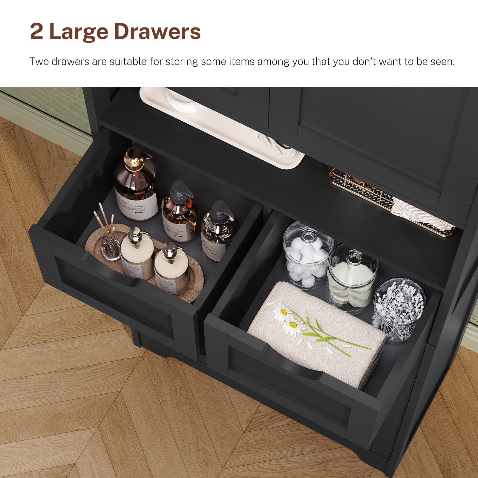 - ⭐【Storage Genius】If you're looking for a bathroom cabinet with enough space for various things, this is perfect. It has a top compartment with adjustable shelf, two middle drawers and a bottom cabinet. Effortlessly organise your bath towel, Shampoo and shower gel, hair stuff, hair towels, etc. This bathroom cabinet can help you sort a sea of toiletries into an organized collection.