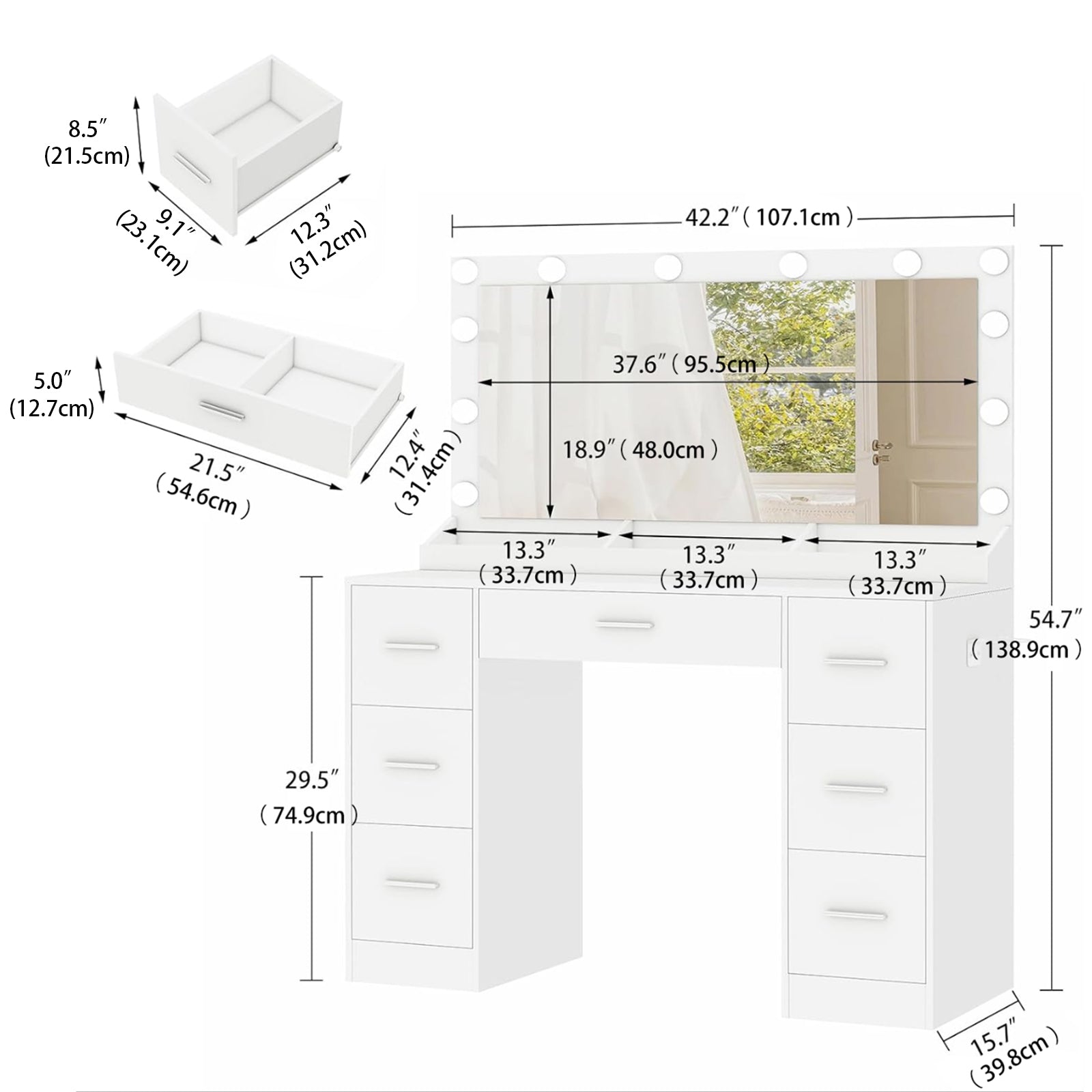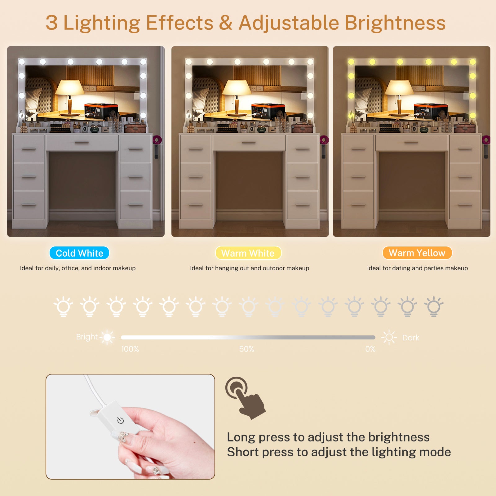 - Rich Ambient Lighting: The vanity desk with mirror and lights is equipped with a large HD mirror and 12 LED bulbs, the vanity mirror has 3 lighting modes: warm light, white light and cool light. Whether it's day or night, the makeup desk provides you with a great makeup experience, allowing you to enjoy professional quality in the comfort of your home.