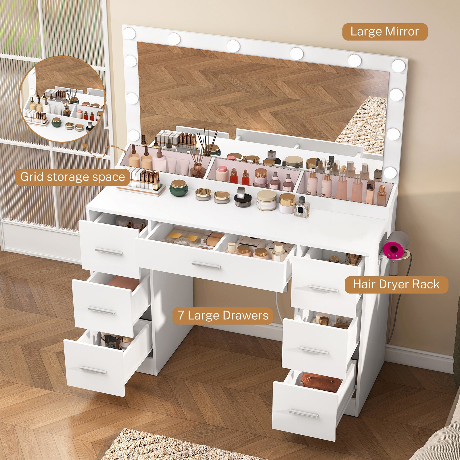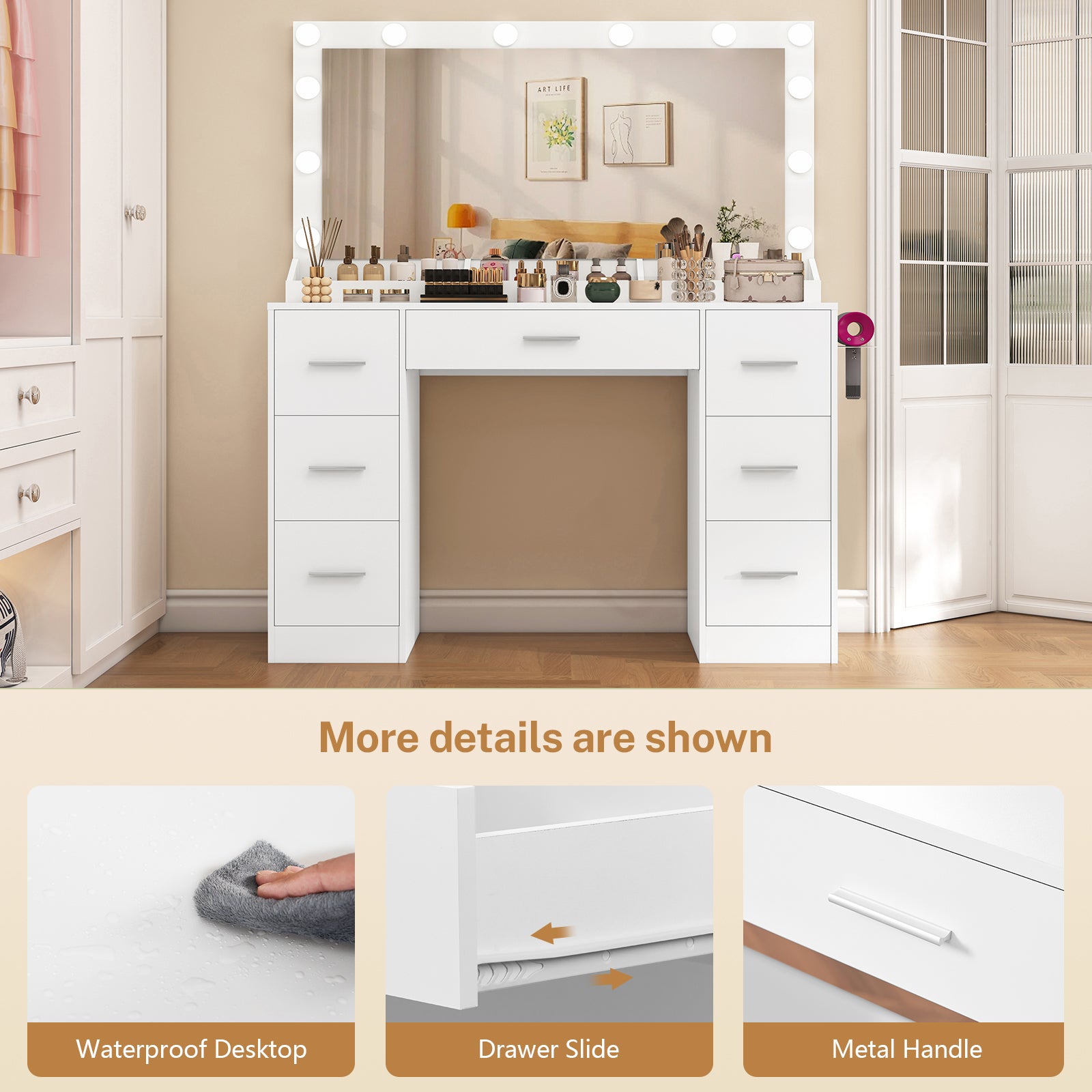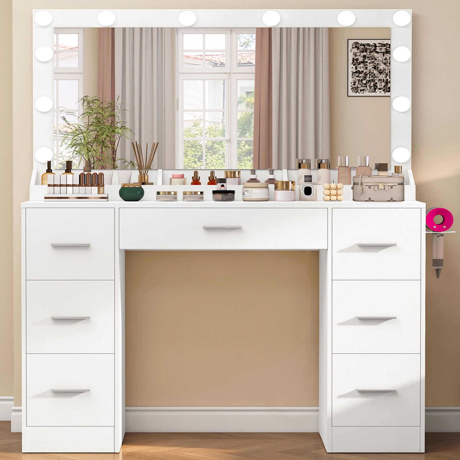 TEENFON Dressing Table with Large Mirror and 12 LED Lights, Vanity Desk with 7 Drawers & Hairdryer Holder, Vanity Table Makeup Desk for Women, Girls, 3 Lighting Color Adjustable, White