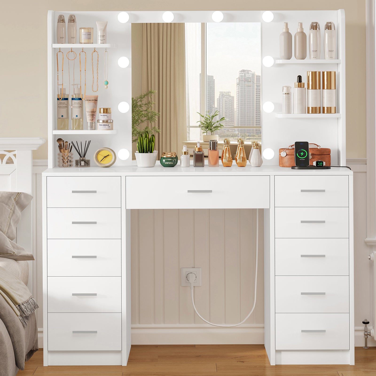 TEENFON Grande Coiffeuse avec Miroir et Lumière LED, 3 Couleurs Réglables,Table de Maquillage avec 11 Tiroirs, 4 Étagères et 5 Crochets, Coiffeuse Moderne, Blanc