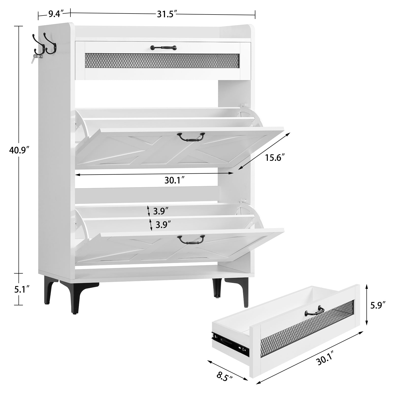 TEENFON Shoe Cabinet with 2 Flip Drawers, Shoe Storage Cabinet with Mesh Sliding Drawer, Freestanding Shoe Organizer with Metal Legs & 2 Hooks, Narrow Shoe Rack for Entryway, Hallway, White