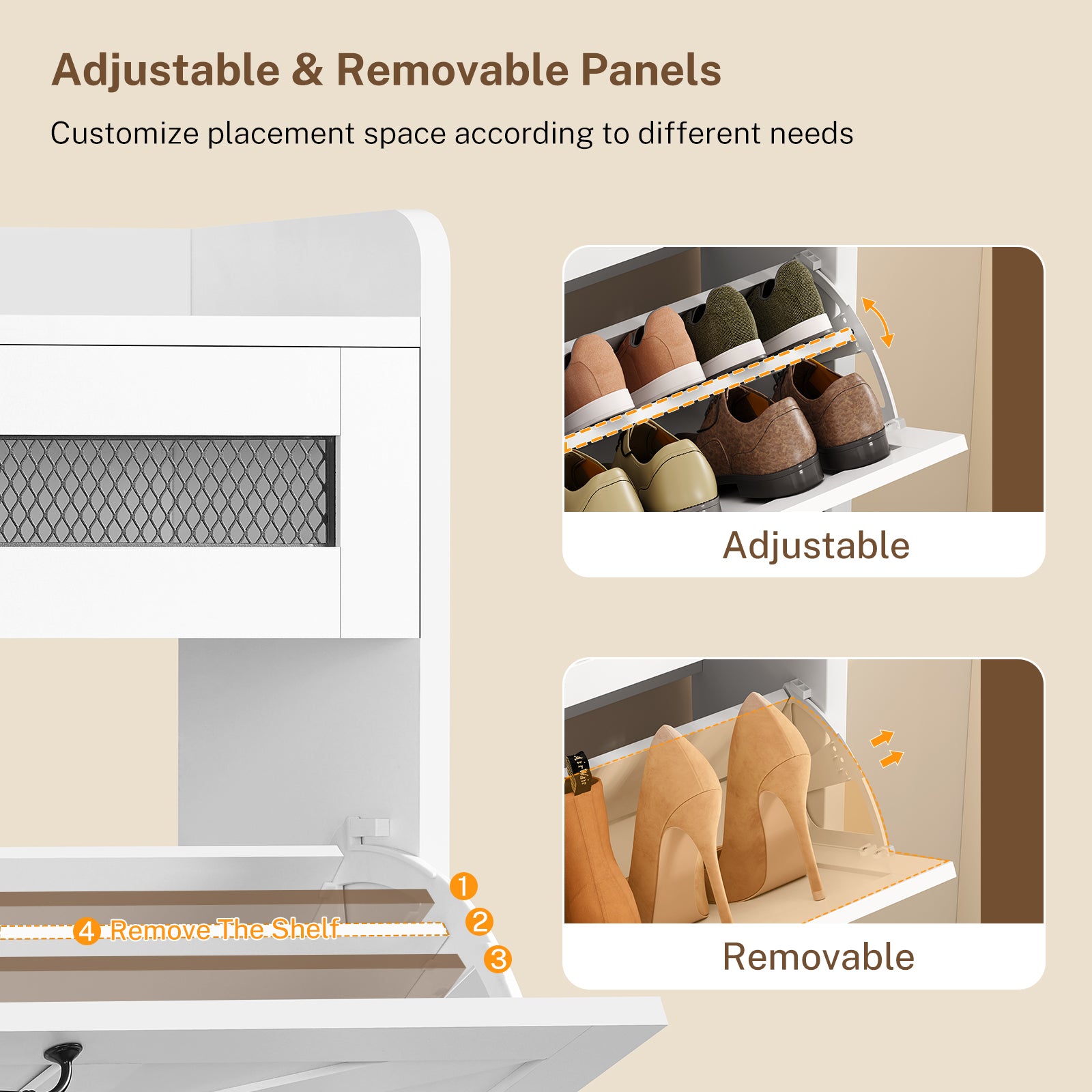 - 【Keep Your Shoes Neat & Odor-Free】The shoe cabinet features 2 flip drawers that can store 16-20 pairs of shoes. The shoes rack cabinet comes with 2 adjustable shelves, easily accommodating everything from flats to boots. The open-back design of the white shoe cabinet promotes air circulation inside, helping to prevent odors