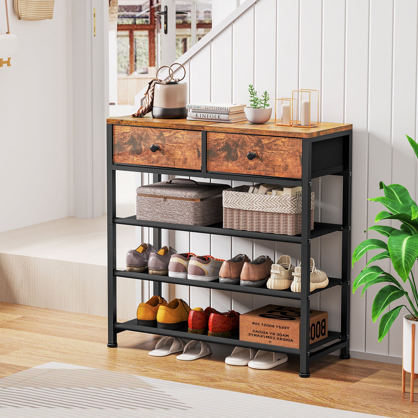 TEENFON Shoe Rack, 4 Tier Shoe Storage Organizer with 2 Drawers, Metal Shoe Shelf for 9-12 Pairs of Shoes, with 3 Oxford Fabric Shelves and Wooden Top, Shoe Stand for Entryway, Rustic Brown