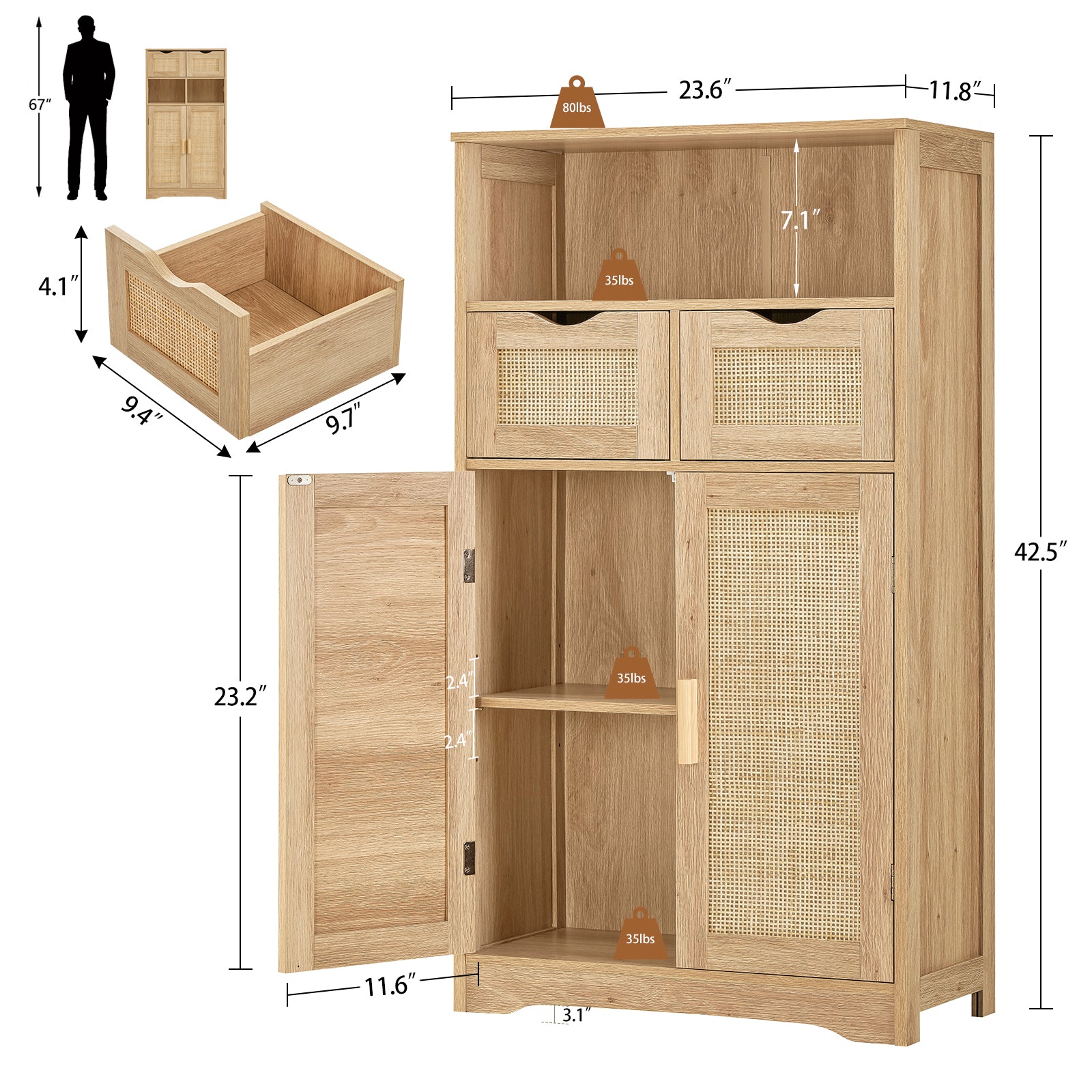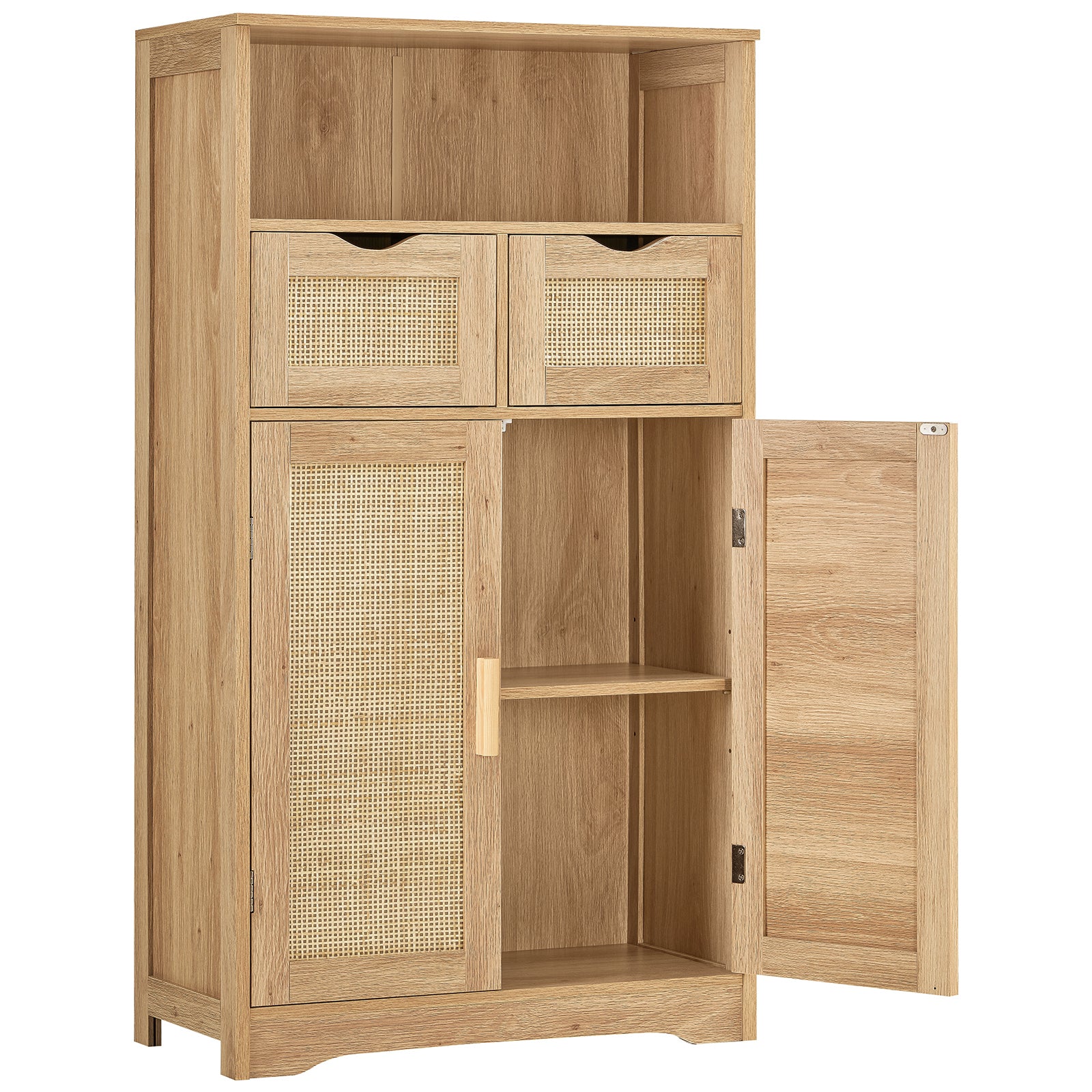 TEENFON Storage Cabinet with 2 Drawers & Adjustable Shelves, Rattan Cabinet, Kitchen Pantry Cabinets, Cupboard for Living Room, Kitchen, Home Office, Natural