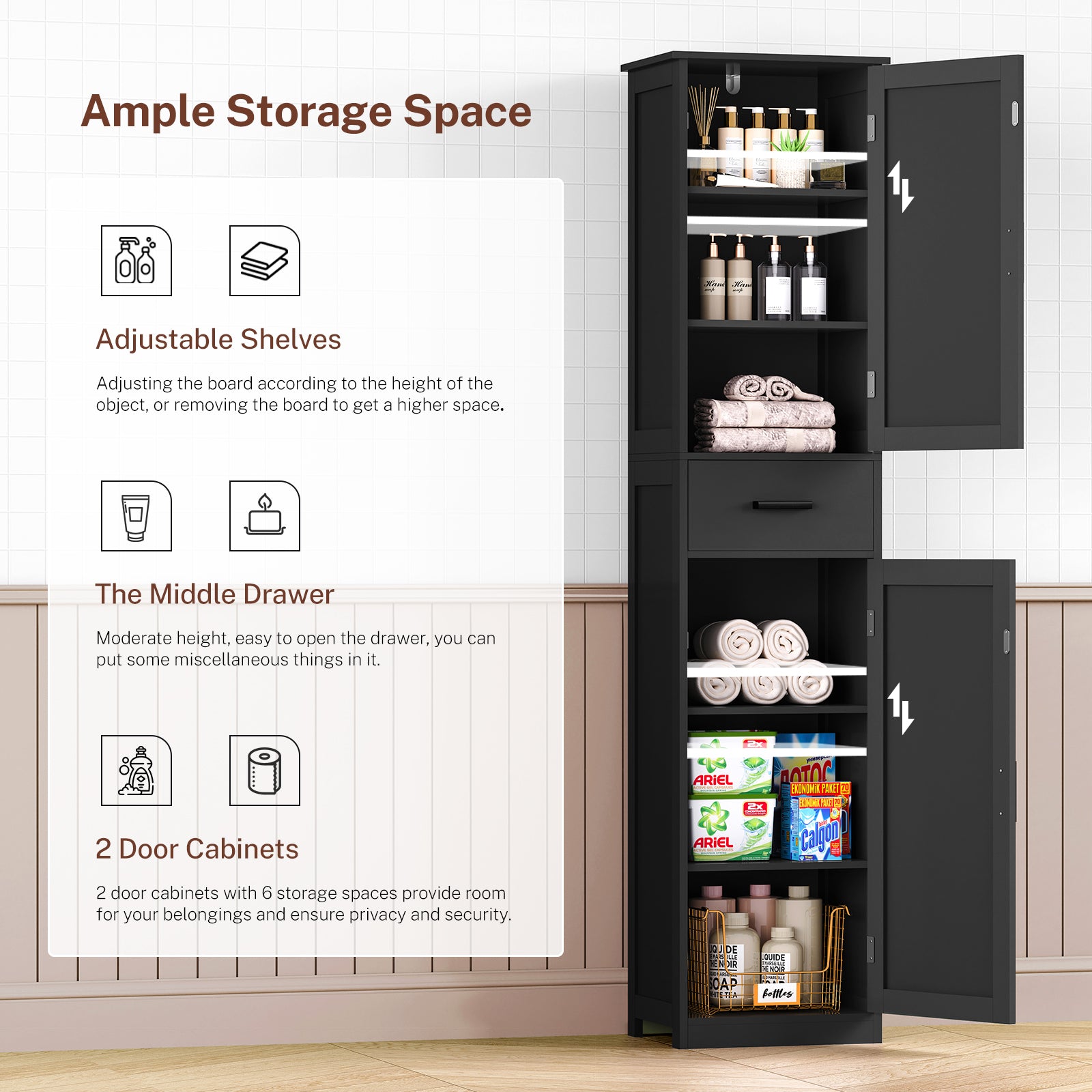 - Fits Everywhere: This versatile storage cabinet has a wide range of usage scenarios. It can be used to store surplus cans and food in the kitchen, with the drawer being perfect for small items such as spices. In the bathroom, it can be used to store shower gel, soap, and toilet paper. In the living room, it can be used to store CDs, books, and ornaments