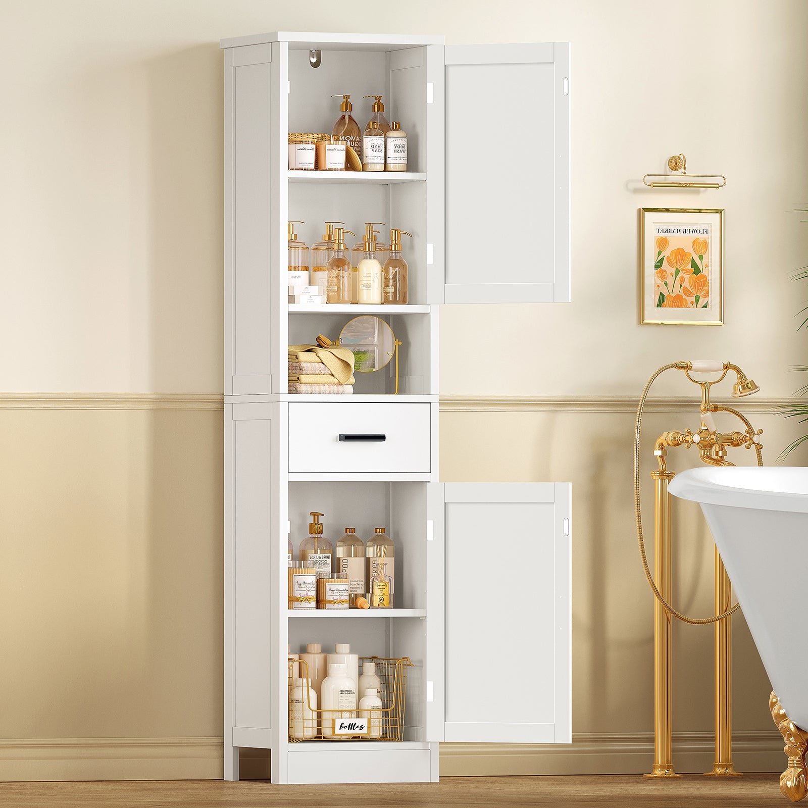 - ⭐Plenty of Storage:Tired of dealing with clusttered bathroom space? Meet the teenfon Bathroom Cabinet—your ultimate storage fix! With 6 handy compartments inside the door, you can organize towels, shampoo, body wash, and more. The spacious drawer is perfect for soaps, lotions, and other daily essentials. The open shelf is ideal for displaying your favorite aromatherapy and decorative items.