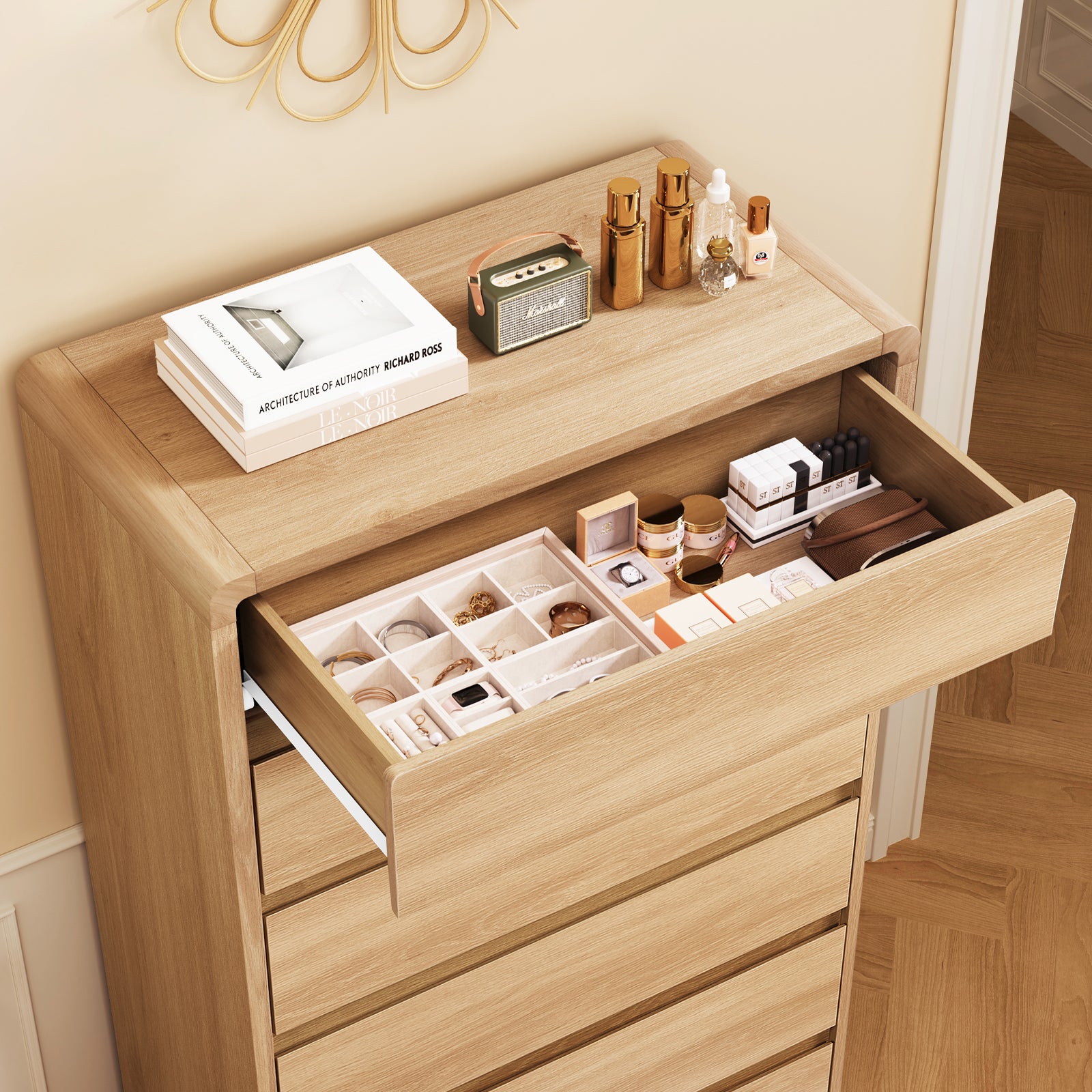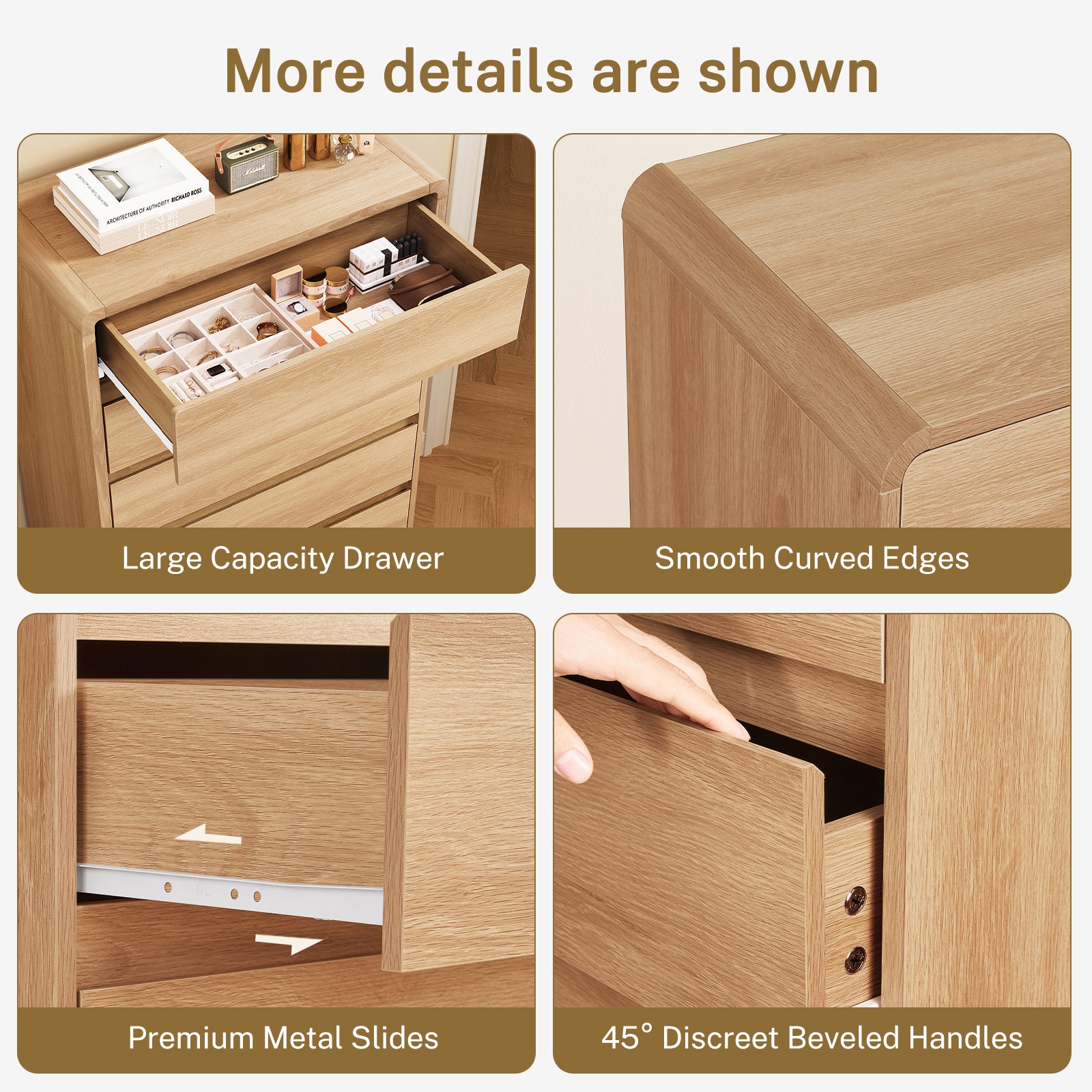 - ⭐【Safety Meets Style】We curved the front and rounded every corner for more than just looks. It’s about creating a piece that feels safe and welcoming in a busy household. The seamless, handle-less drawers prevent snags and add to the serene, uncluttered aesthetic. Not only a dresser for bedroom. Also as a beside table, clothing organizer, entryway cabinet and even kids' rooms dresser.