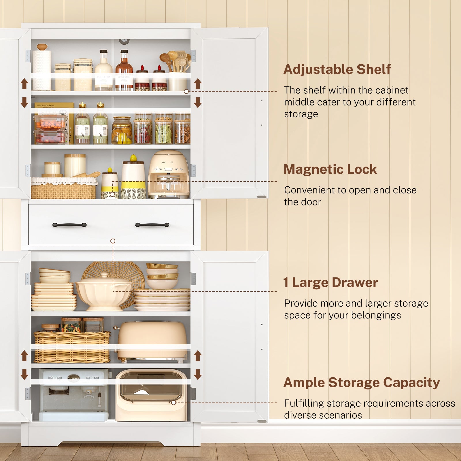 - ⭐【Your Storage, Your Rules】 Stop letting fixed shelves dictate your space. With 2 adjustable shelves, you can easily customize the interior to fit everything from clunky cereal boxes to hefty small appliances. The spacious central drawer is your secret weapon for storing snacks, tableware or cookbooks. Paired with 2 fixed shelves for stability, it's the perfect blend of flexible and dependable storage, designed to evolve with your needs.