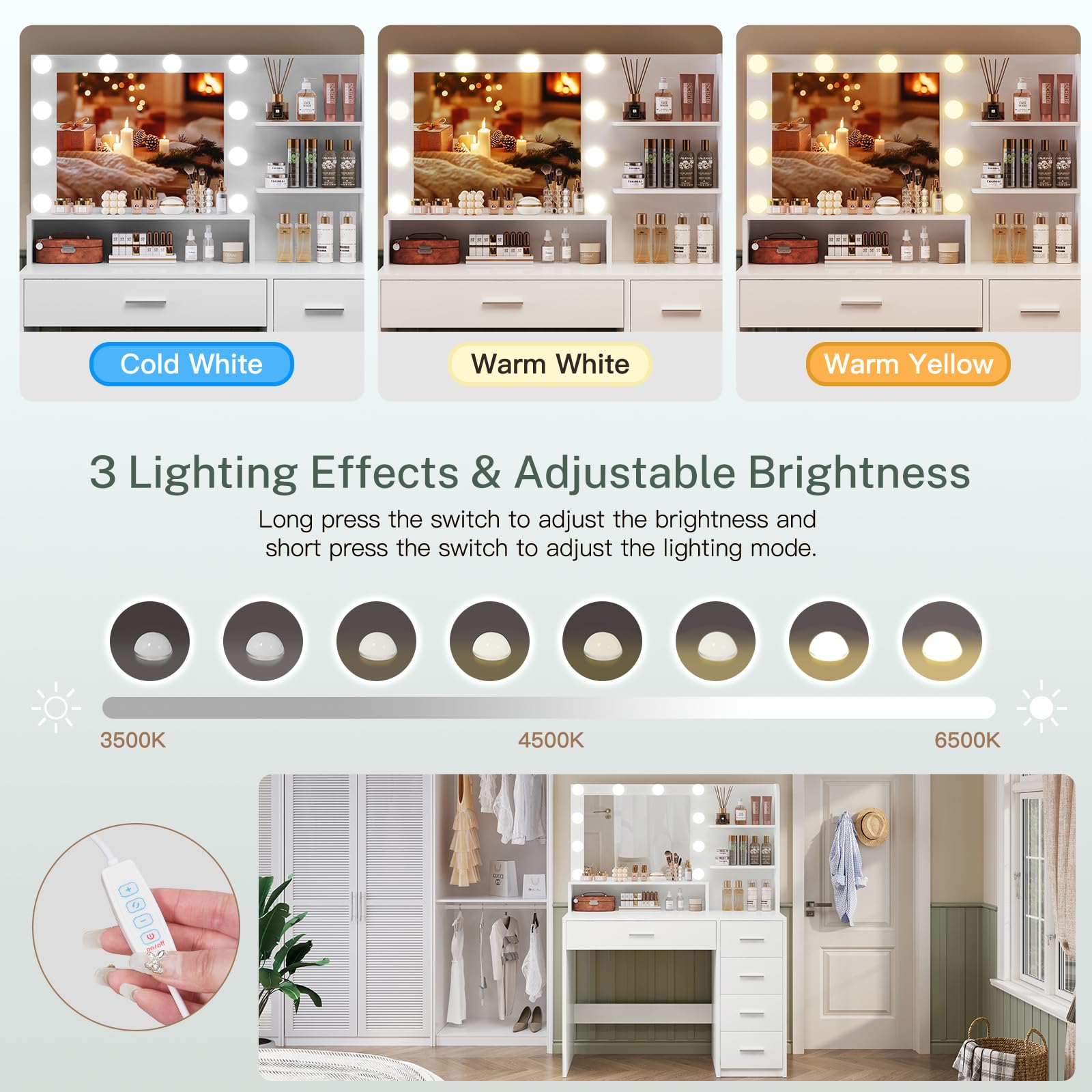 TEENFON Vanity Desk with Mirror and Lights, Makeup Vanity with 5 Drawers and 3 Storage Shelves, 3 Color Modes & Adjustable Brightness Dressing Table, Vanity for Girls, White