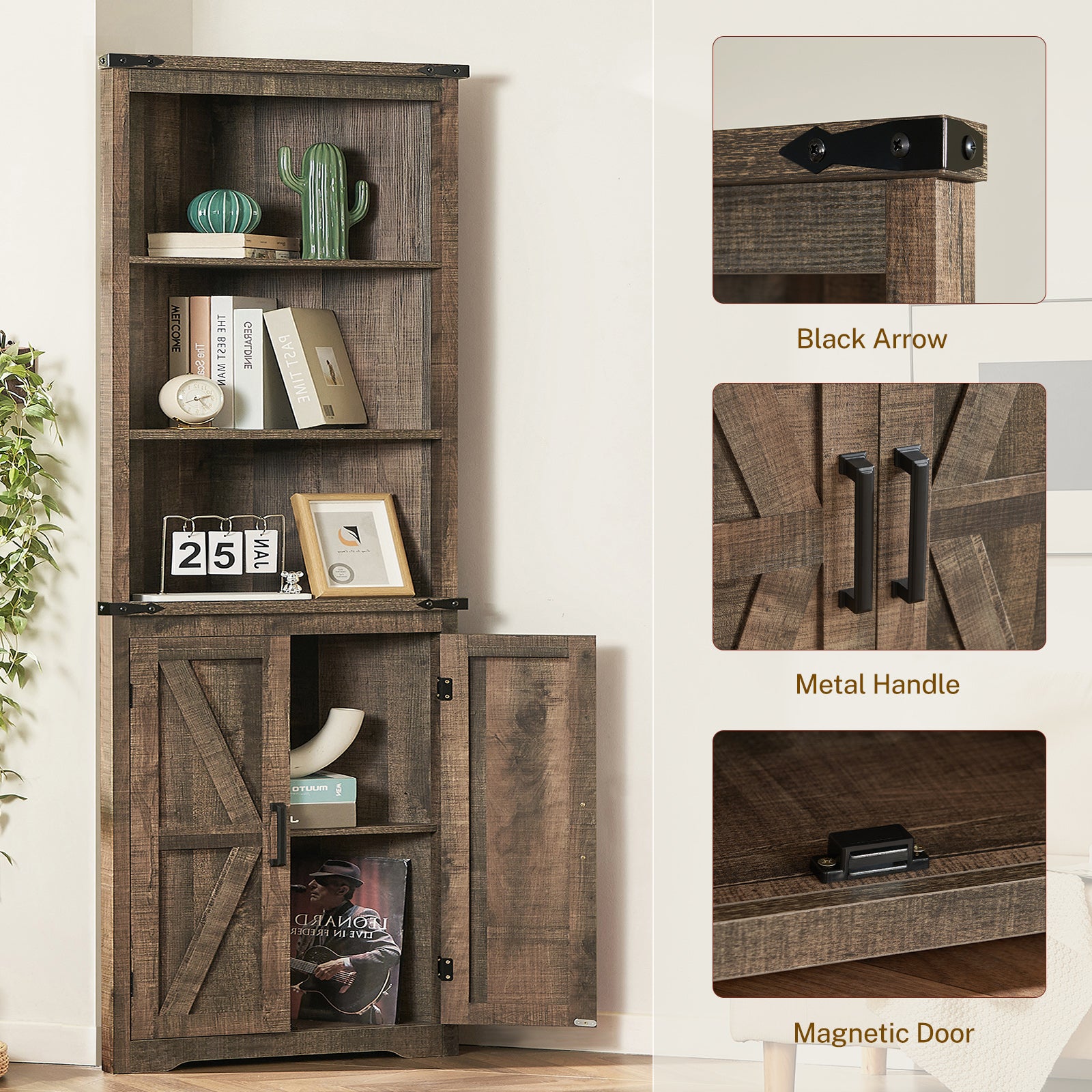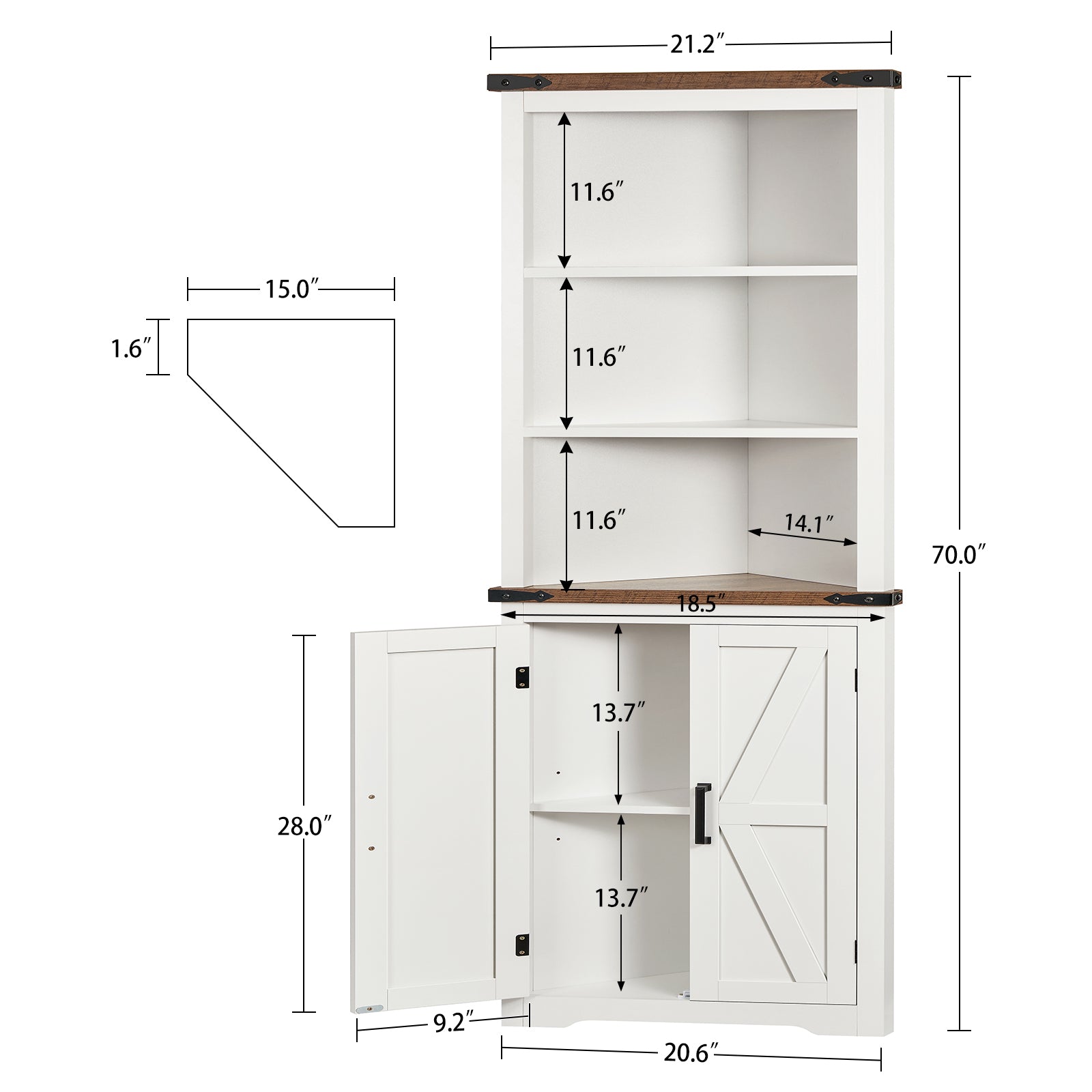 TEENONF Farmhouse Corner Cabinet, 70" H Tall Corner Hutch with 5 Shelves & 2 Barn Doors, Bathroom Cabinet with Adjustable Shelf, for Living Room, Kitchen, Bathroom, White