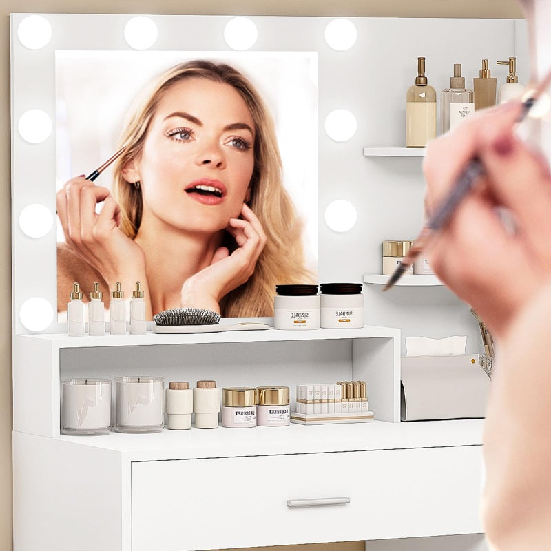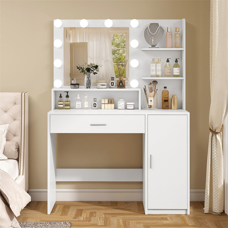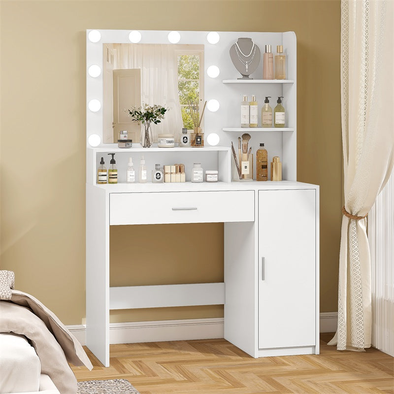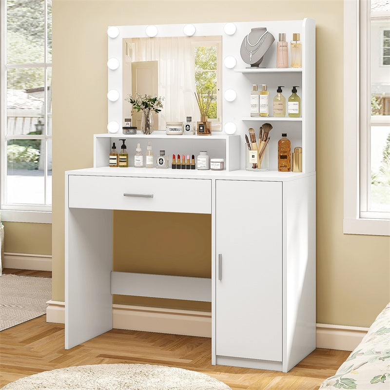 Vanity Desk with 10 Lights & Mirror, 3 Storage Shelf, Big Drawer, Cabinet with Shelves, 3 Lighting Modes & Adjustable Brightness Dressing Table, Small Makeup Vanity, 35.4” Desk, White